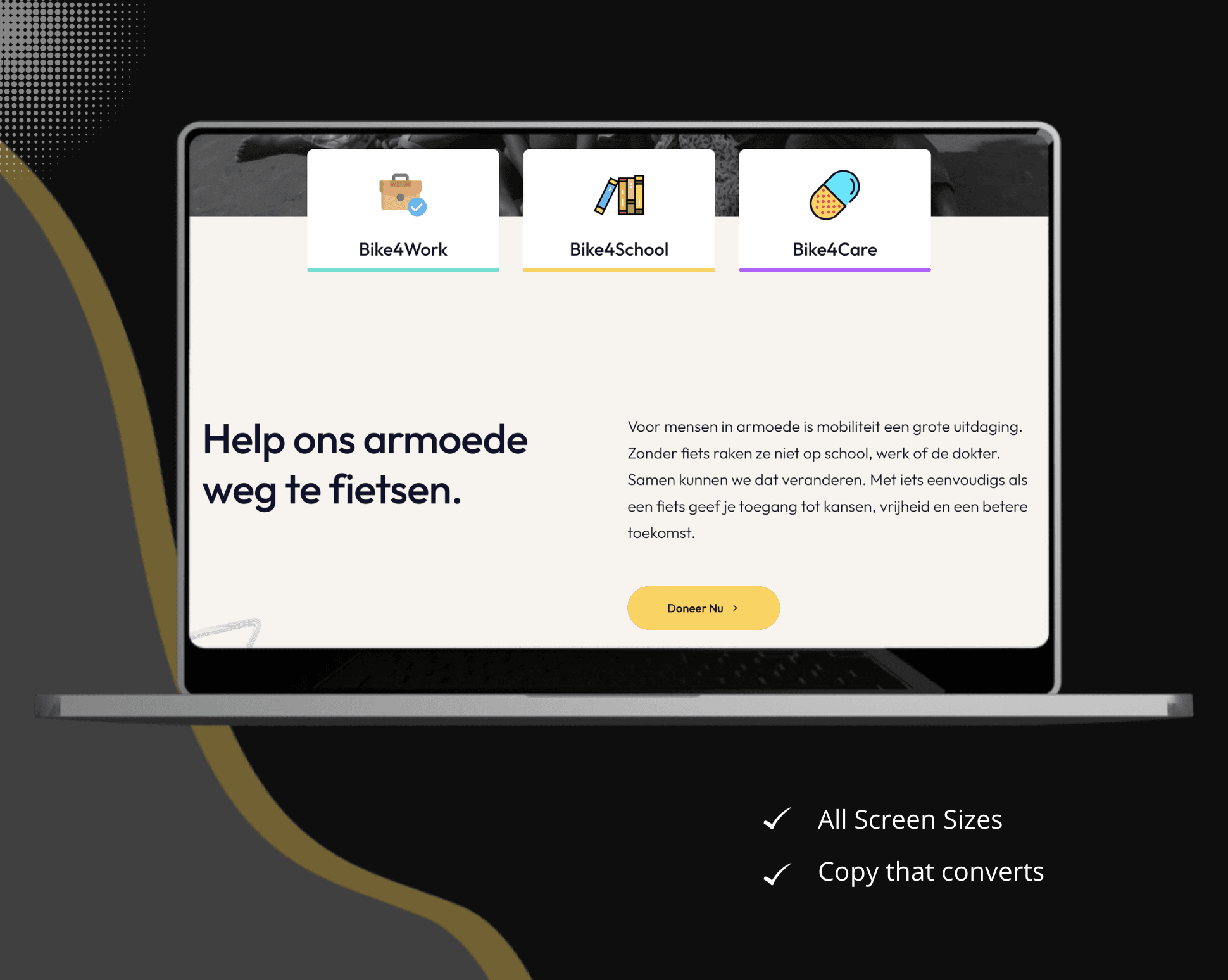 Fietsen uit de Armoede (Cycling Out of Poverty) raises money to provide bicycles to people in Africa, helping them access education, work, and essential services that would otherwise be out of reach. We wanted to help the charity tell their story more clearly and make donating as easy as possible. By building a website in their native language, we helped create a stronger bridge between supporters in Belgium and the communities they are empowering abroad.