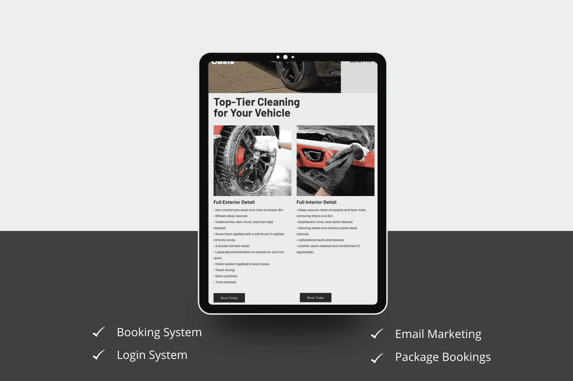 We created a professional website for Oasis Car Detailing to help streamline the customer experience — from choosing a package to booking a slot and receiving updates. The site includes a full booking system, login functionality, automated email marketing, and tailored package options.